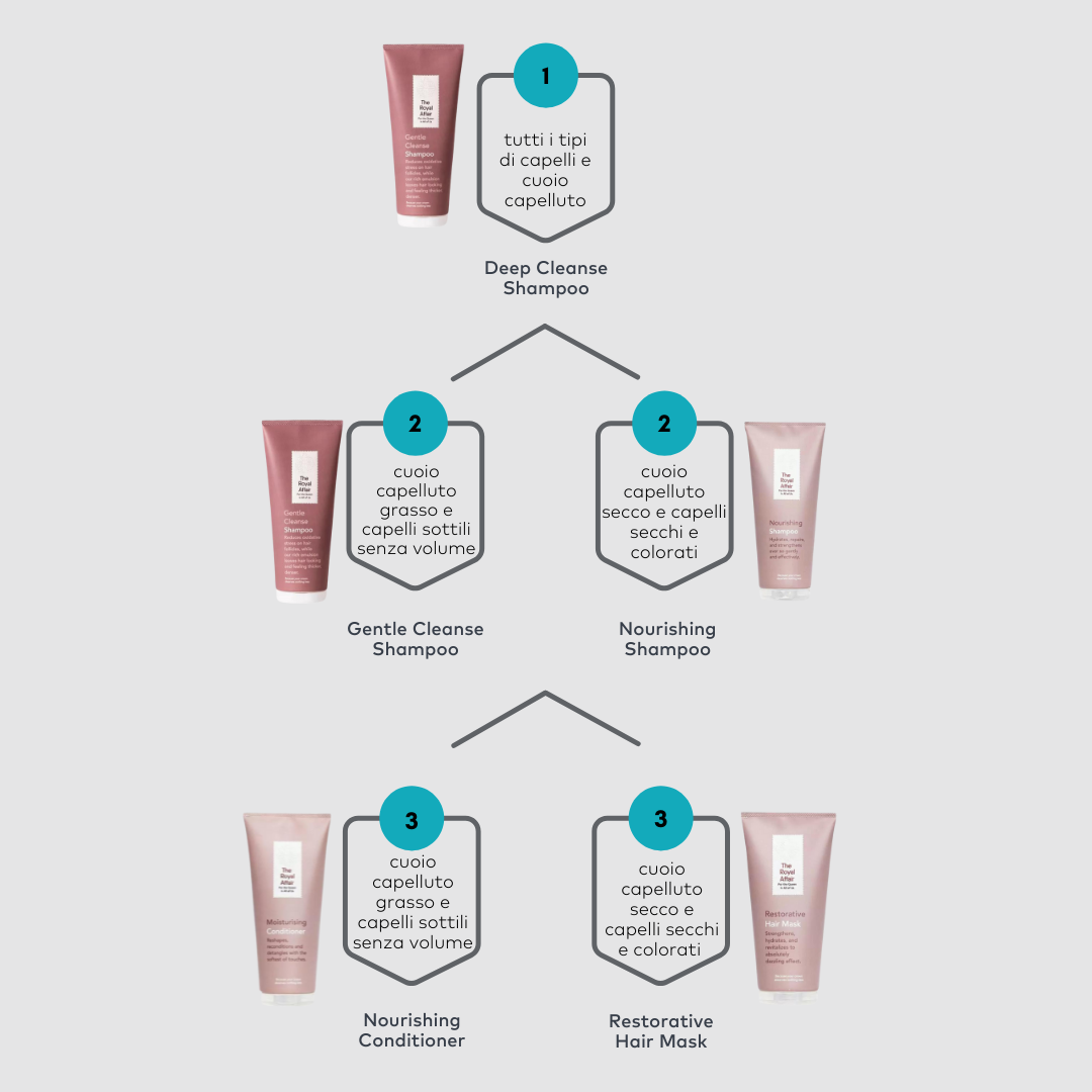 Se i tuoi capelli e il tuo cuoio capelluto sono secchi e colorati, il Nourishing Shampoo sarà la scelta giusta per te nella seconda fase di detersione. Se hai un cuoio capelluto grasso e i tuoi capelli sono sottili e senza volume, ti consigliamo il Gentle Cleanse Shampoo per la seconda fase di detersione. Questo shampoo è idratante ma non appesantisce i capelli.